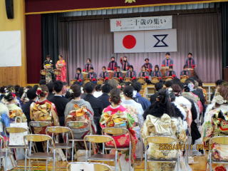 | 鷹丘校区「二十歳の集い」 令和6年1月7日 新型コロナ感染症が「5類感染症」となり初めて大きな行事「二十歳の集い」は、無事に開催されました。 ご父兄の皆様も多数ご列席され、とてもにぎやかな式となりした。 久しぶりの再会に、皆で楽しそうに談笑されている光景がとても微笑ましく印象的でした。 |